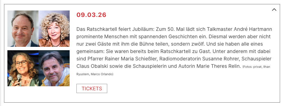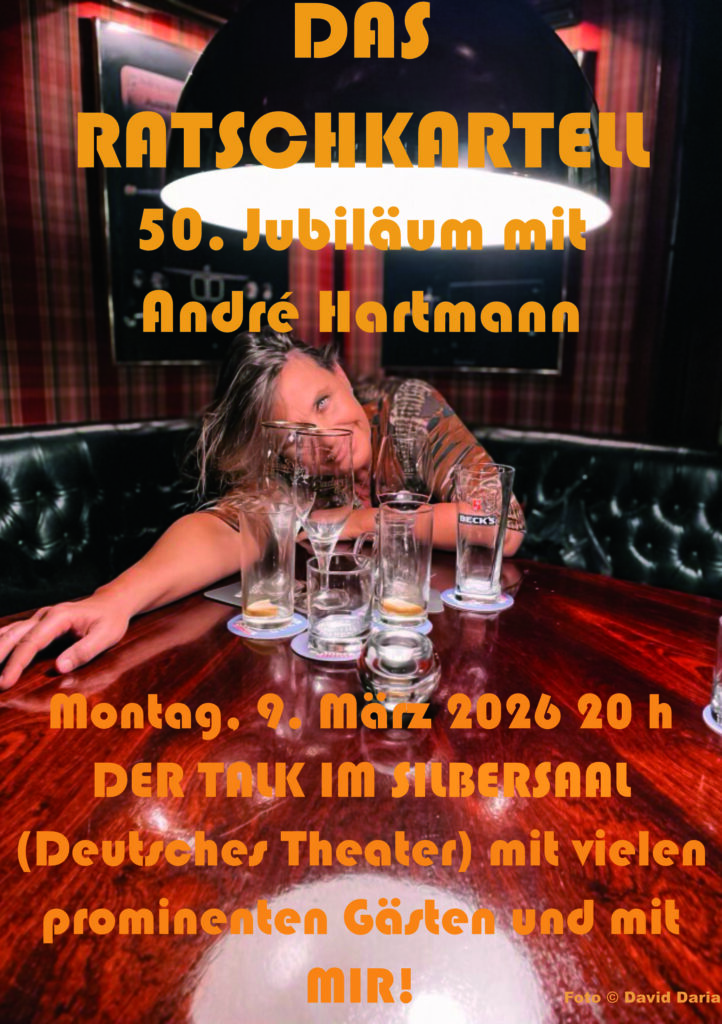 Zum 50. Ratschkartell, am Montag, den 09. März 2026 talkt Gastgeber André Hartmann mit vielen Gästen aus früheren Ratschkartellen, u.a. mit: