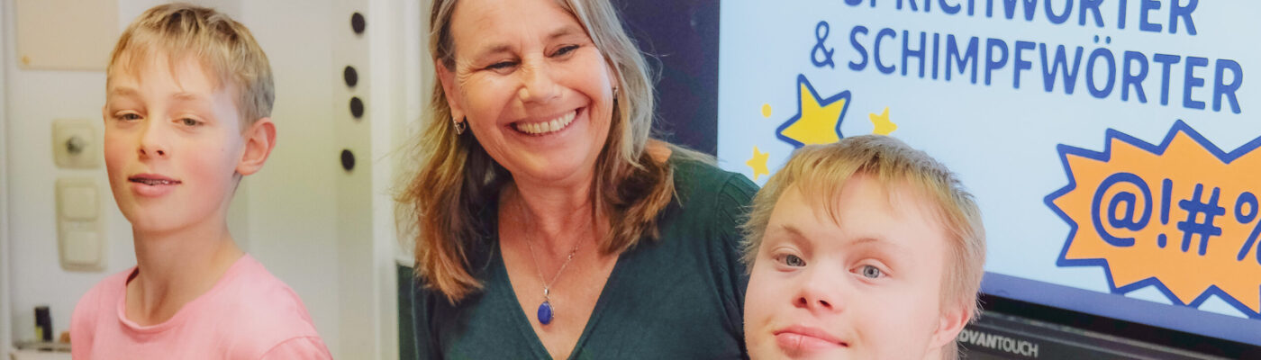 Dafür kamen sogar berühmte Gäste zu uns: Die Schauspielerin, Journalistin und Autorin Marie Theres Relin arbeitete drei Tage lang mit den Kindern an Sprich- und Schimpfwörtern und begeisterte alle mit ihrer Liebe zum gesprochenen Wort. „Die Schönheit der Sprache gilt es erneut zu entdecken und dafür engagiere ich mich gerne an dieser besonderen Schule“, betonte die Tochter von Maria Schell. Für Gänsehautmomente sorgte Inklusions-Rapper Graf Fidi, der die Turnhalle mit seinem Auftritt zum Beben brachte und anschließend geduldig Fragen beantwortete. Im Synchronsprecher-Workshop mit Oliver Mink, der deutschen Stimme von Mark Wahlberg, erfuhren die Teilnehmenden, wie sehr sich die Wirkung eines Satzes verändern kann – je nachdem, wie man ihn spricht.